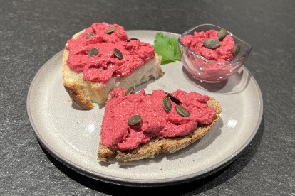 Die Rote Bete trägt viele Namen: In Bayern sagt man Rote Rübe – andernorts Rahner oder Ranne. Ihre kräftige Farbe verdankt sie dem Betanin, ihr Geschmack ist mild-erdig. Kombiniert mit Frischkäse und Meerrettich wird daraus ein cremiger Aufstrich, der nicht nur gut aussieht, sondern auch richtig gut schmeckt.