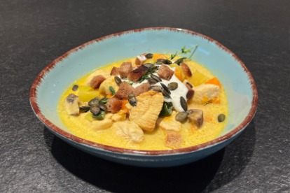 Zum Servieren den Hähnchentopf in einer Schale anrichten und mit den Brotcroûtons und Kürbiskernen garnieren.